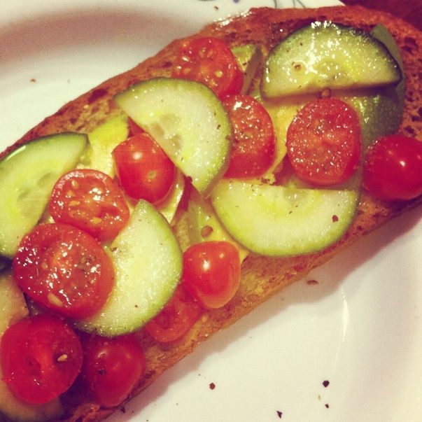Home-made sandwiches with whole wheat bread, avocados, cherry tomatoes, cucumbers, and olive oil make me happy.