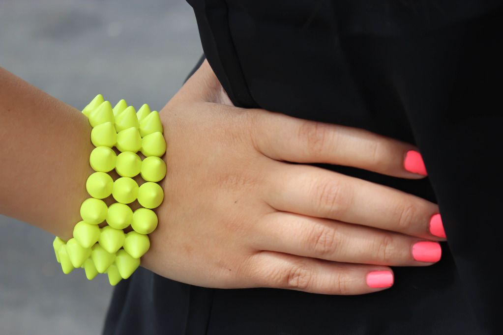 haul, you'll know that I have this obsession for neons and spiked accessories - two trends I never imagined myself wearing, but somehow I've come to love them. And dressing in all black? It's not something I do often yet I love how it makes the neon pop in this case. So, after a few weeks of not wearing heels, I slipped on a pair yesterday (oops! wore them in